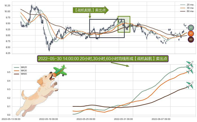 ⚀ 2022-05-20 13:00:00小时-2022-06-08 14:00:00小时显现 20小时-30小时-60小时均线 【战机起航】卖出点 看空信号,后市看跌,卖出