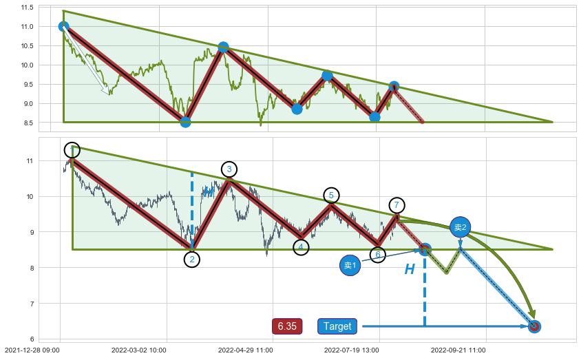 ➣ 【阻力】空方的卖盘使高点阻力位【③⑤⑦】逐步降低 构成三角的倾斜下降阻力斜边