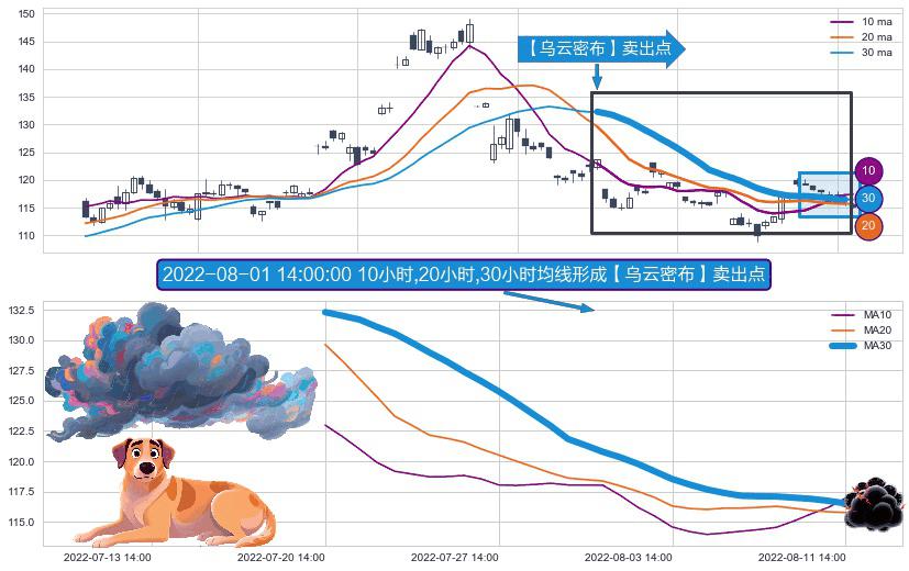⚀ 2022-07-20 14:00:00小时-2022-08-12 13:00:00小时显现 10小时-20小时-30小时均线 【乌云密布】卖出点 看空信号,后市看跌,卖出