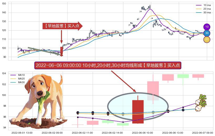 ⚀ 2022-06-06 09:00:00小时显现 10小时-20小时-30小时均线 【旱地拔葱】买入点 看多信号,后市看涨,买入