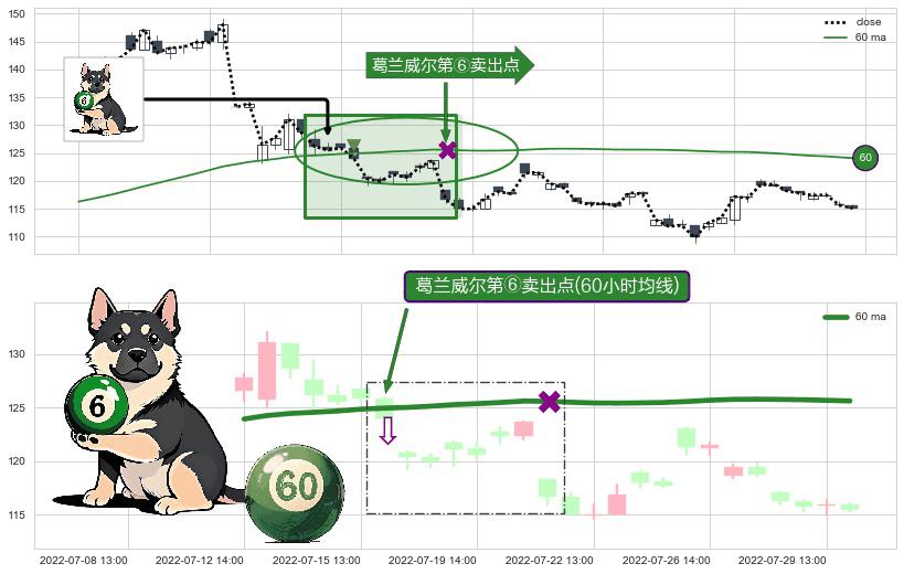⚀ 2022-07-15 14:00:00-小时显现 葛兰威尔均线 60小时均线 第⑥卖出点 走势反转见顶信号,后市看跌,卖出信号