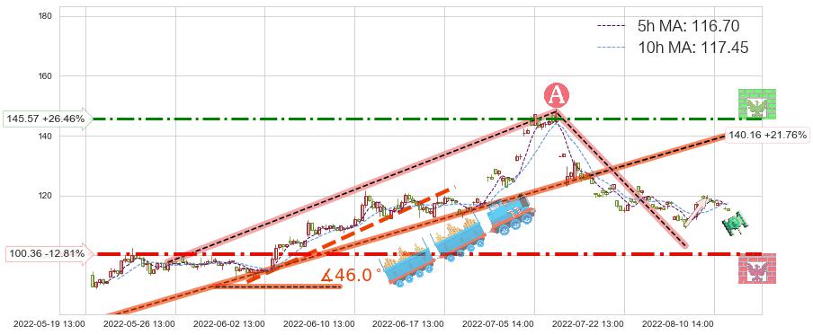 ➣ 2022-05-20 09:00-2022-07-15 13:00上升趋势存在反转[风险],其原上升趋势的支撑位(140.16)已破位[强阻力信号],原上升趋势角度: 46.0˚