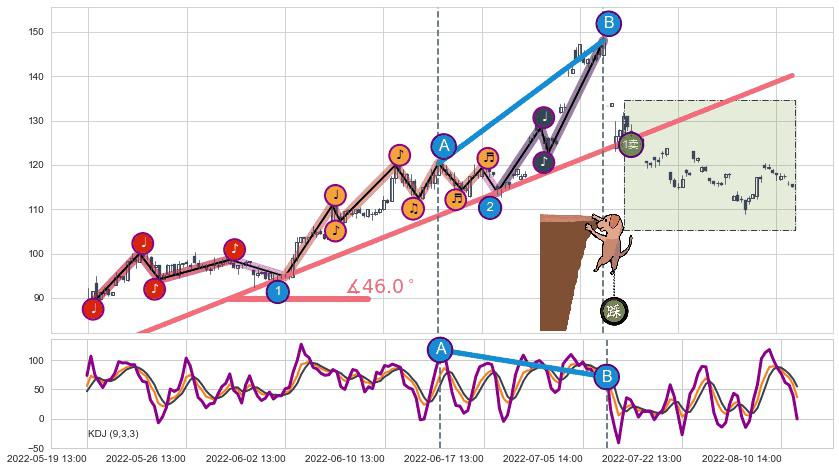 从2022-05-20 09:00至2022-07-15 13:00,共包含139个小时,阶段股价上涨36.98%,阶段股价变动位移路程比: 1 : 5,上涨趋势角度: 46.0