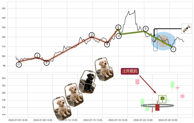| 14 🅚:下跌抵抗 ➕ 🌊:波浪理论上涨5浪延续回调:猜想回调C点击穿破位,猜想持续蓄力回调abc下跌方向(大周期趋势均值回复后小周期持续趋势跟踪) ☞ 看空信号 ⇥ 【🅚线】交织【图形】⇥ 综合量化分数: 47 | > |