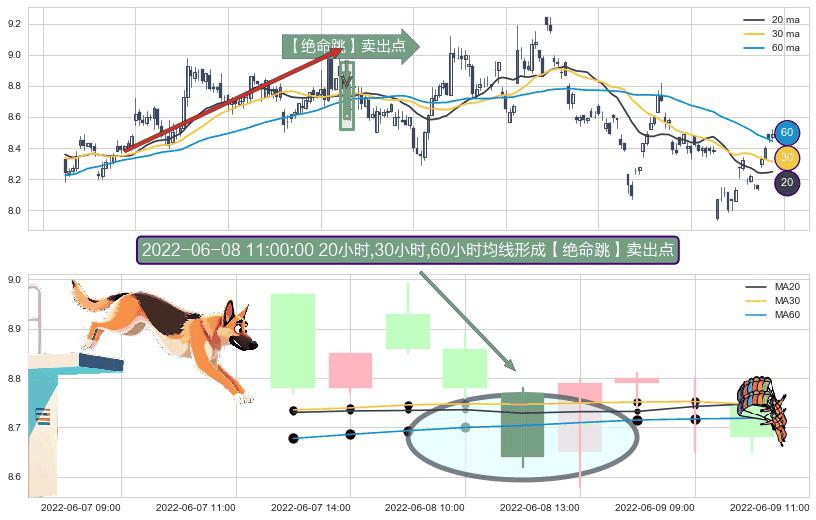 ⚀ 2022-06-08 11:00:00小时显现 20小时-30小时-60小时均线 【绝命跳】卖出点 看空信号,后市看跌,卖出