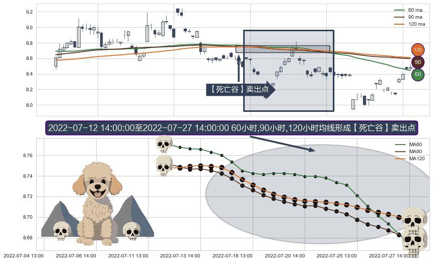 ⚀ 2022-07-13 13:00:00-小时至2022-07-27 14:00:00-小时显现 60小时-90小时-120小时均线 【死亡谷】卖出点 看空信号,后市看跌,卖出