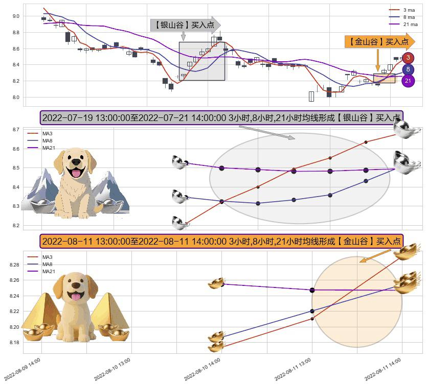 ⚀ 2022-08-11 14:00:00-小时至2022-08-11 14:00:00-小时显现 3小时-8小时-21小时均线 【金山谷】买入点 其再次确认了买入信号,可靠性更强,买入