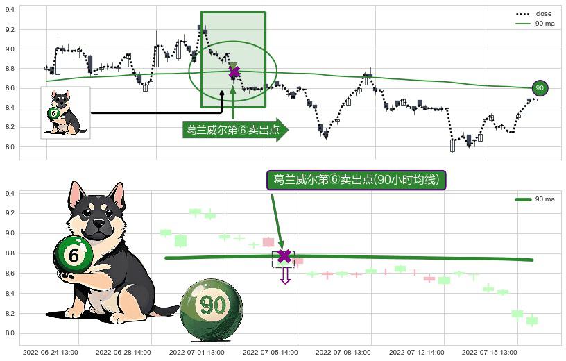 ⚀ 2022-07-05 13:00:00-小时显现 葛兰威尔均线 90小时均线 第⑥卖出点 走势反转见顶信号,后市看跌,卖出信号