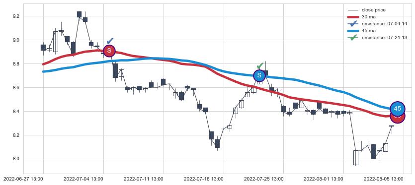 ⚂ 2022-06-07 11:00:00-小时均线向上突破,2022-07-25 13:00:00-小时重新下穿均线破位,均线阻力再次生效
