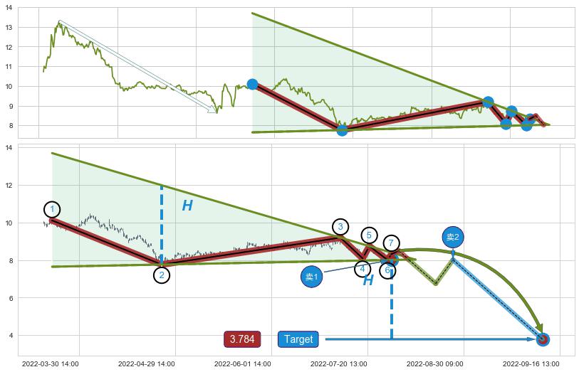 ➢ 最小中继整理跌幅→𝐇: 4.22 (低点逐步抬高斜边第一支撑点②与阻力边垂直距离)