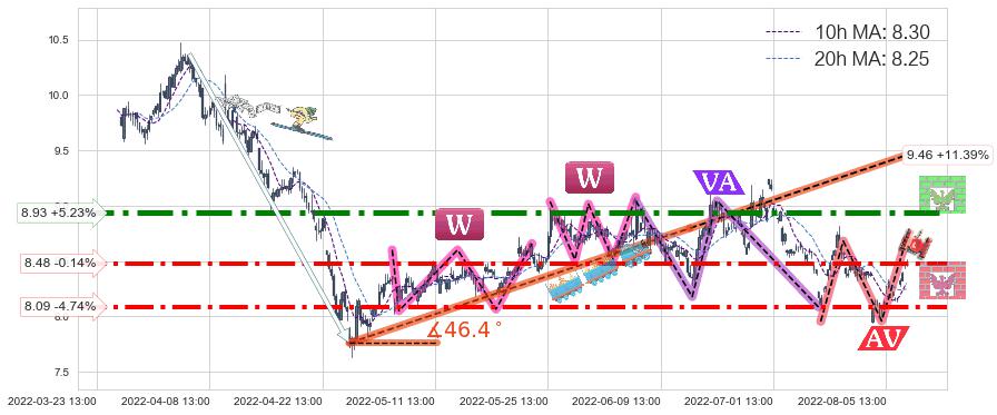 ➢ 【仅预测突破】最后价格:8.49与预测突破价格:8.59→【空间中等】后续最小【整理】第一目标价格→(08-23:14: 9.80 )