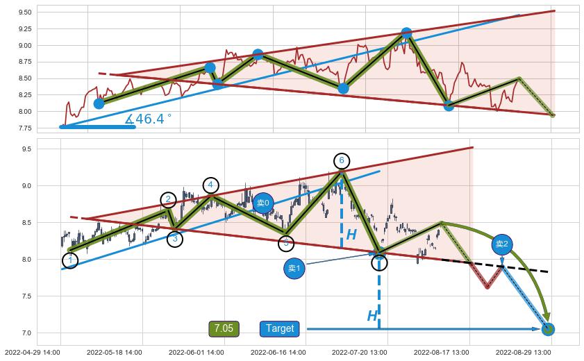 从2022-04-27 09:00至2022-06-14 10:00,共包含152个小时,阶段股价上涨8.12%,阶段股价变动位移路程比: 1 : 12,上涨趋势角度: 46.4