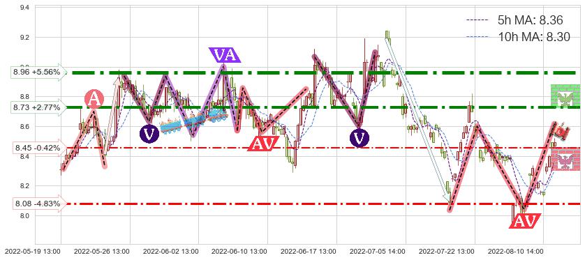 ♘ 阻力价格位8.73,可信任强度80.49%,距离最后交易2022-08-12 14:00形成的收盘价格8.49相差 +2.77%