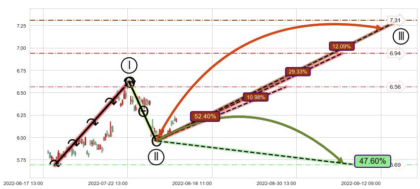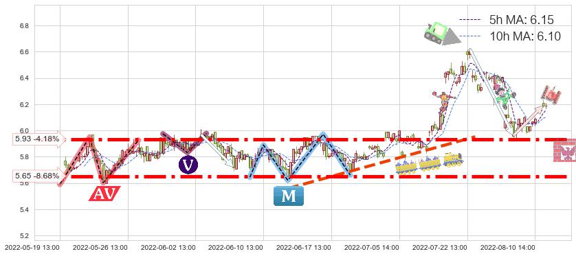 ♘ 支撑价格位5.93,可信任强度90.86%,距离最后交易2022-08-12 14:00形成的收盘价格6.19相差 -4.18%