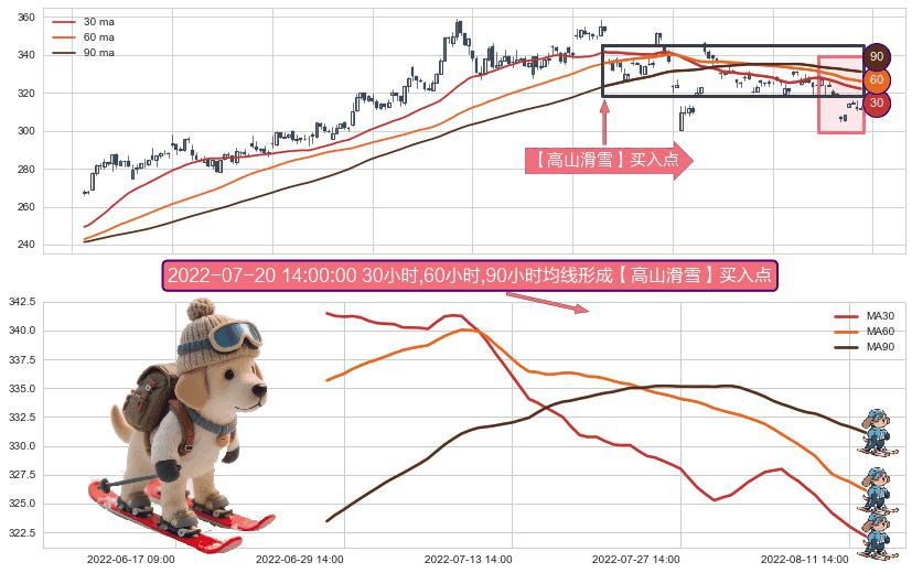 形态多维评估: ⚀ 2022-06-28 14:00:00小时-2022-08-12 14:00:00小时显现 30小时-60小时-90小时均线 【高山滑雪】买入点 看多信号,后市看涨,买入