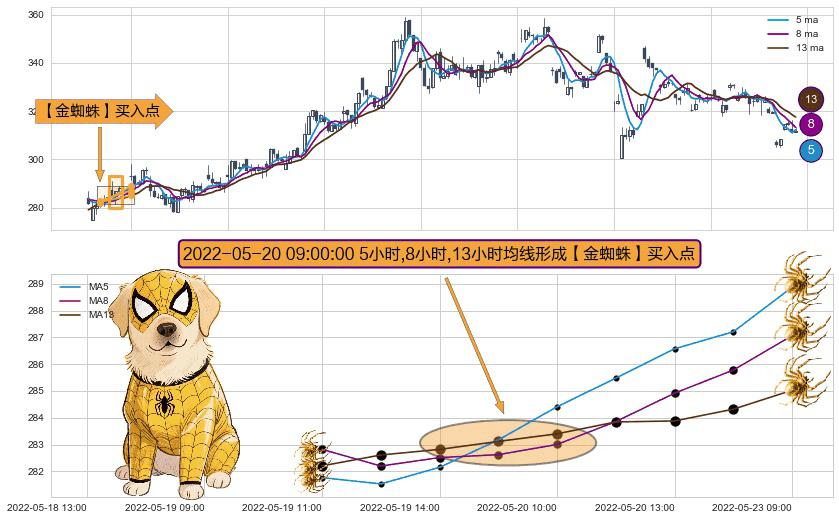 形态多维评估: ⚀ 2022-05-20 09:00:00小时显现 5小时-8小时-13小时均线 【金蜘蛛】买入点 看多信号,后市看涨,买入