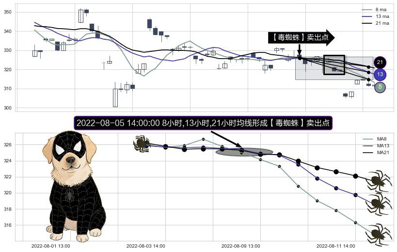 形态多维评估: ⚀ 2022-08-03 13:00:00-小时至2022-08-05 14:00:00-小时显现 3小时-8小时-21小时均线 【死亡谷】卖出点 看空信号,后市看跌,卖出