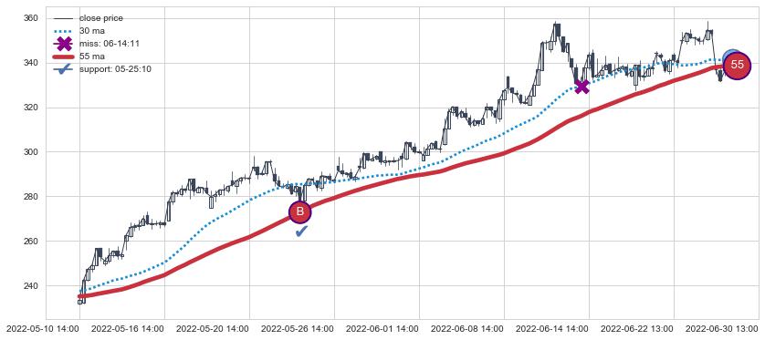 上涨趋势05-10 14:00-06-30 13:00,均线55确认关键支撑1处