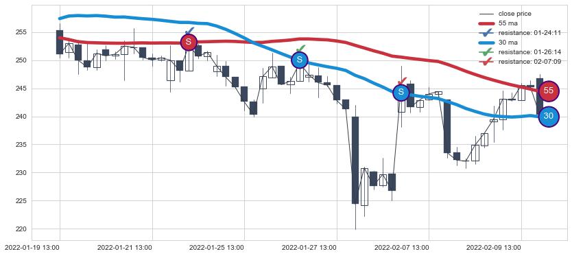 下跌趋势01-19 13:00-02-10 09:00,均线30, 55确认关键阻力3处