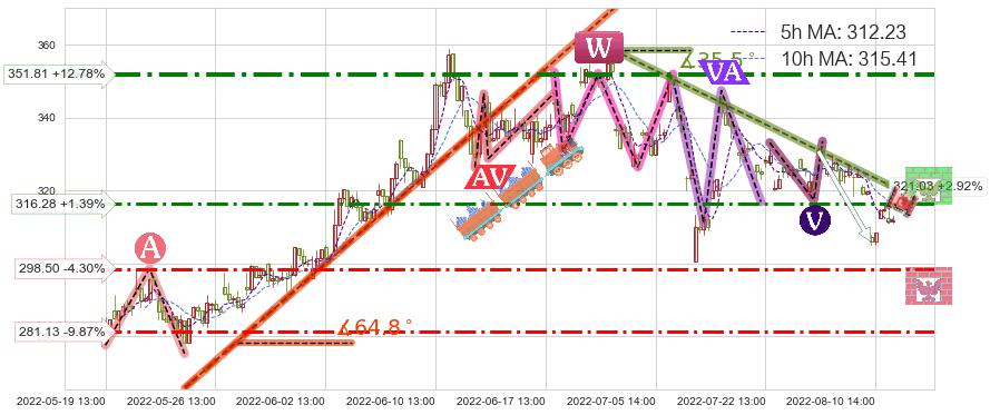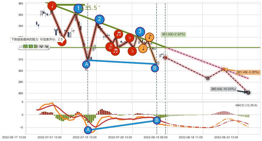 ➣ 预测:2022-08-22 11:00,【试探阻力】稳定目前下跌趋势的前提下,预测价格:301.49
