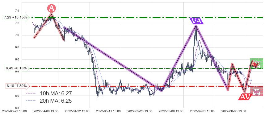 ♘ 阻力价格位7.29,可信任强度73.43%,距离最后交易2022-08-12 14:00形成的收盘价格6.44相差 +13.15%