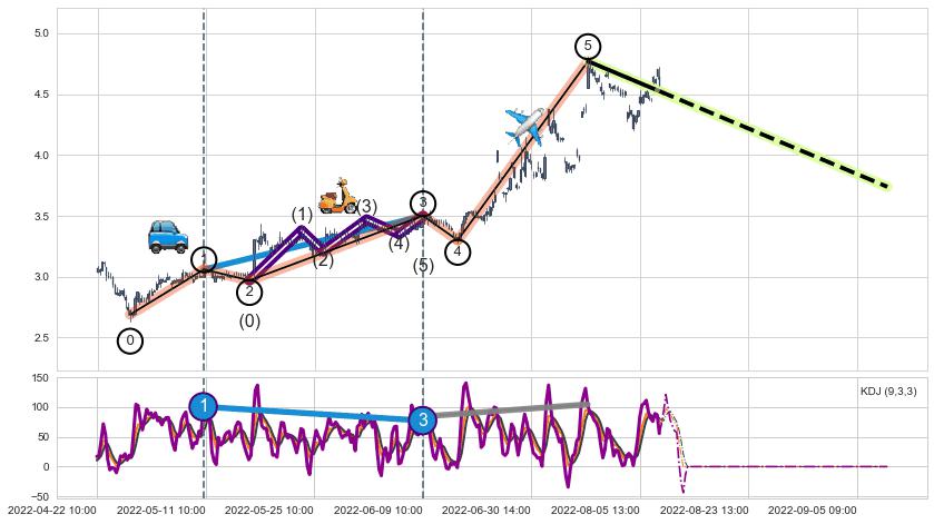 ➣ 第一, 三驱动浪端点:【KDJ】走势出现【常规背离 & 反转信号】背离程度34.35%,背离夹角角度36.1˚,背离程度较小