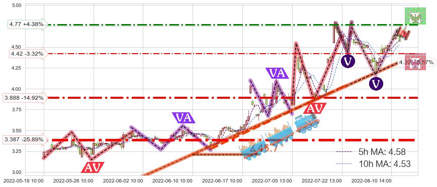 ♘ 阻力价格位4.77,可信任强度60.56%,距离最后交易2022-08-12 14:00形成的收盘价格4.57相差 +4.38%