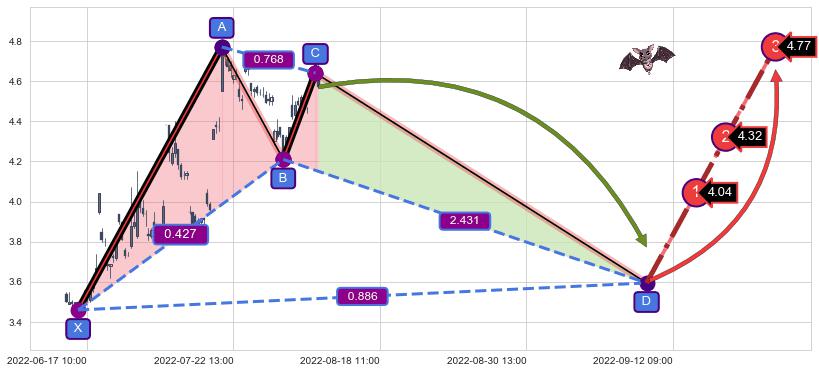 ➣ 未完成【蝙蝠】形态起点X: 06-16:13, 已到达C点: 08-12:13, 预测最终D点: 09-08:12, 共195交易小时