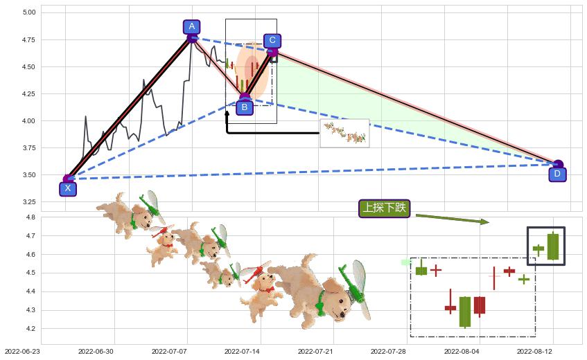 ➣ D点拟合预测价格3.595,距离最后交易收盘价格4.57相差 -21.35%