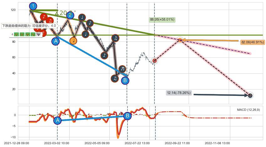 ♘ 在最后的下跌阶段2021-12-29 13:00至2022-06-13 09:00,存在 持续未破位的阻力位 ,阻力价格88.26,可信任强度82.20%,其距离最后价格55.86相差 +58.01%