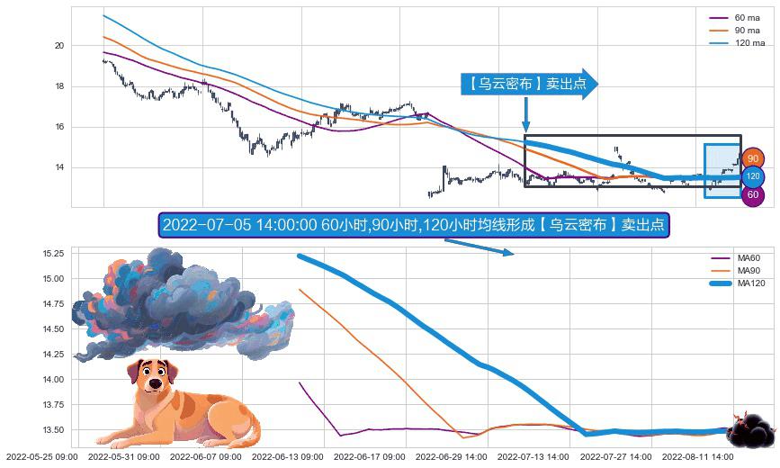 ⚀ 2022-06-09 14:00:00小时-2022-08-12 14:00:00小时显现 60小时-90小时-120小时均线 【乌云密布】卖出点 看空信号,后市看跌,卖出