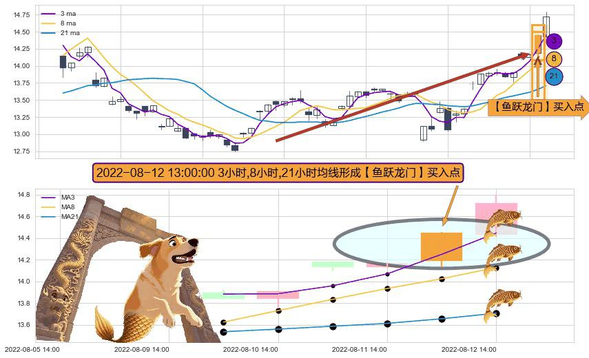 ⚀ 2022-08-12 13:00:00小时显现 3小时-8小时-21小时均线 【鱼跃龙门】买入点 看多信号,后市看涨,买入