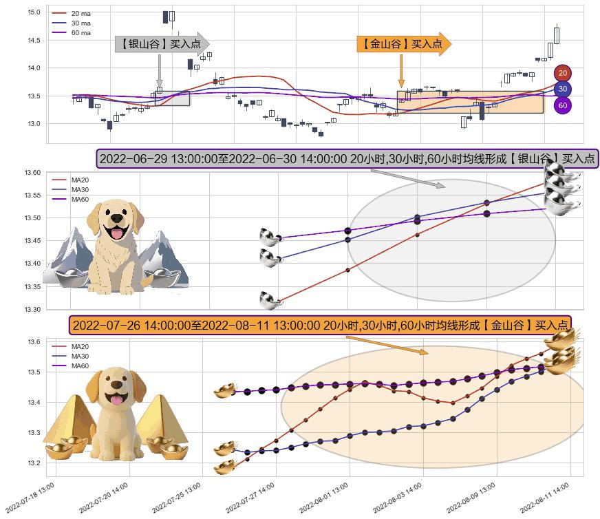 ⚃ 2022-07-27 13:00:00-小时至2022-08-11 13:00:00-小时显现 20小时-30小时-60小时均线 【金山谷】买入点 其再次确认了买入信号,可靠性更强,买入