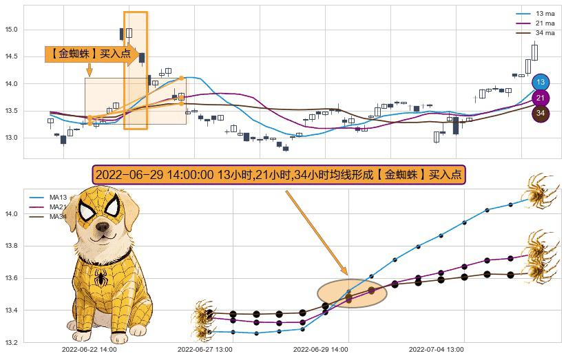 ⚀ 2022-06-29 14:00:00小时显现 13小时-21小时-34小时均线 【金蜘蛛】买入点 看多信号,后市看涨,买入