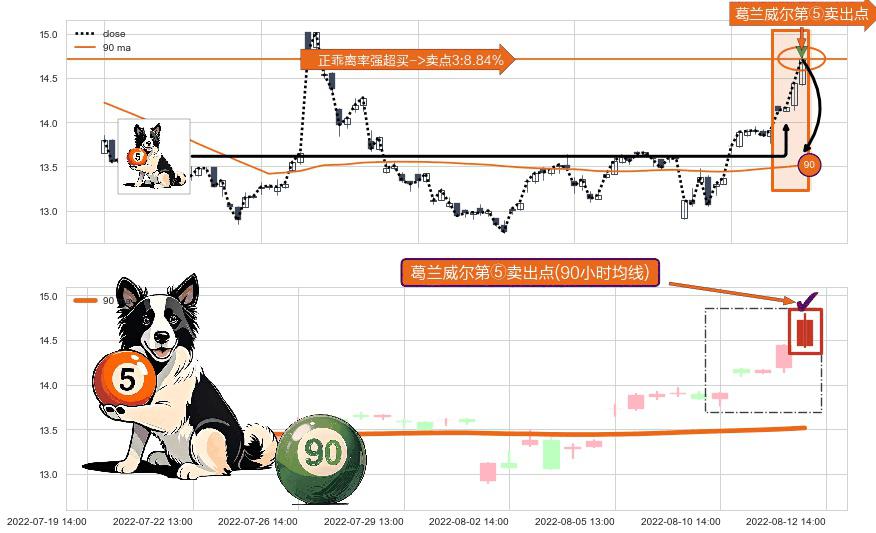 ⚀ 2022-08-12 14:00:00-小时显现 葛兰威尔均线 90小时均线 第⑤卖出点 上升趋势均值回复的短线回落信号,后市看跌,卖出信号