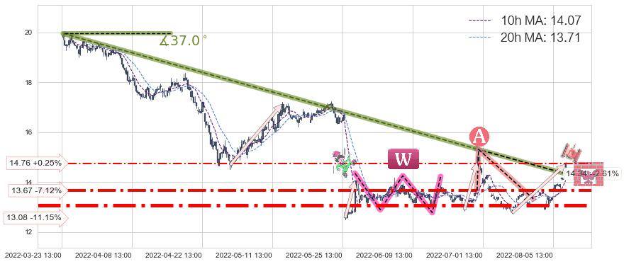 ➢ 预测:2022-08-18 13:00,【试探阻力】稳定目前下跌趋势的前提下,预测价格:13.97