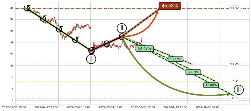 🦴 长线均值回复组合短线趋势跟踪[强阻力信号]2022-03-23 14:00-2022-06-28 14:00下跌趋势依然成立(下跌趋势跟踪依然存在),短线价格略微上行反弹(均值回复猜想),即将接近下跌趋势提供的未破位阻力价格:14.34。