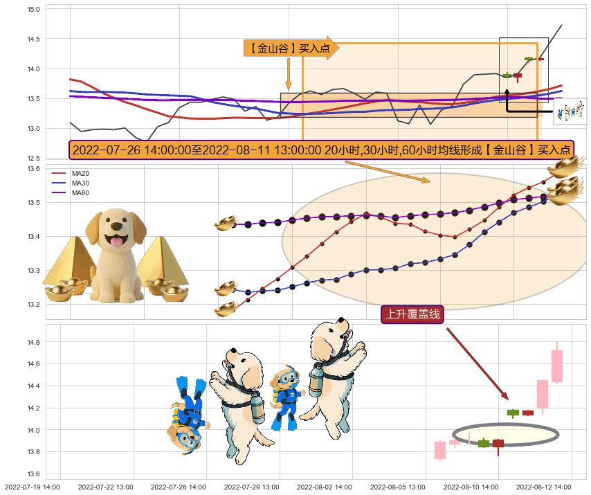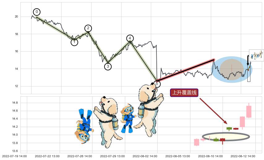 从2022-07-15 14:00至2022-08-12 14:00,共包含39个小时,阶段股价上涨14.62%,阶段股价变动位移路程比: 1 : 2