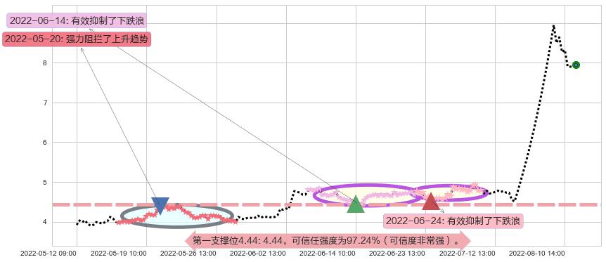 ♞ 第一支撑位4.44价格为4.44,其通过量化计算出的可信任强度为97.24%(可信度非常强)。