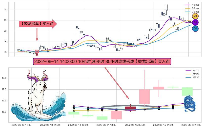 形态多维评估: ⚀ 2022-06-14 14:00:00小时显现 10小时-20小时-30小时均线 【蛟龙出海】买入点 看多信号,后市看涨,买入