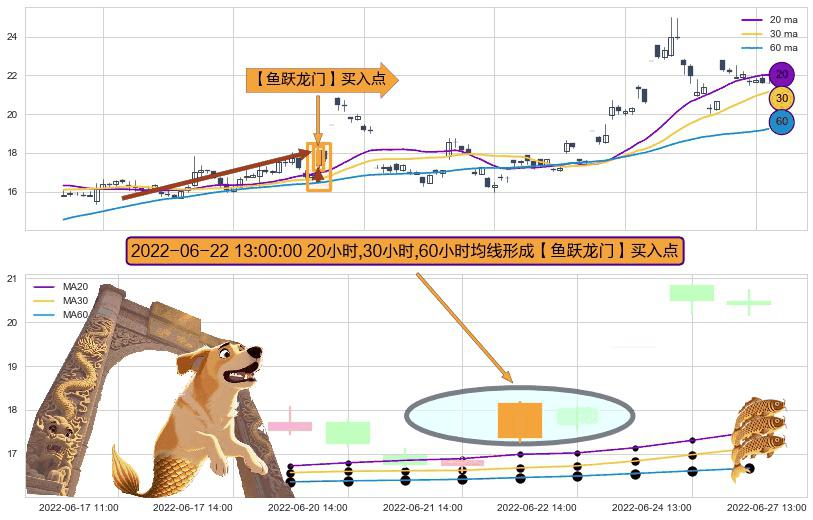 形态多维评估: ⚀ 2022-06-22 13:00:00小时显现 20小时-30小时-60小时均线 【鱼跃龙门】买入点 看多信号,后市看涨,买入