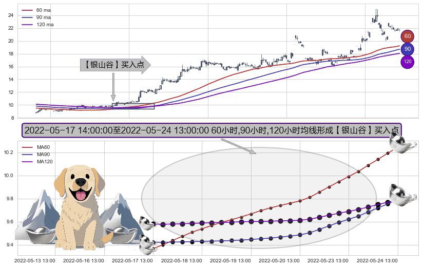 形态多维评估: ⚀ 2022-05-18 09:00:00-小时至2022-05-24 13:00:00-小时显现 60小时-90小时-120小时均线 【银山谷】买入点 看多信号,后市看涨,买入
