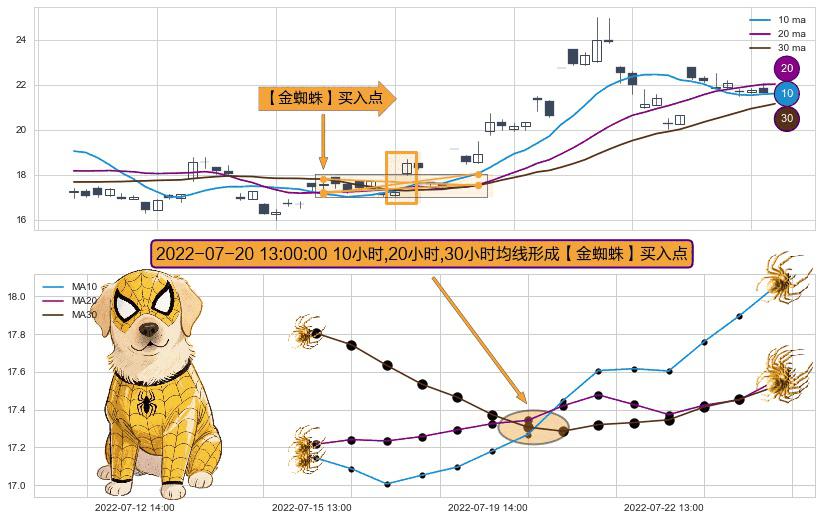 形态多维评估: ⚀ 2022-07-20 13:00:00小时显现 10小时-20小时-30小时均线 【金蜘蛛】买入点 看多信号,后市看涨,买入