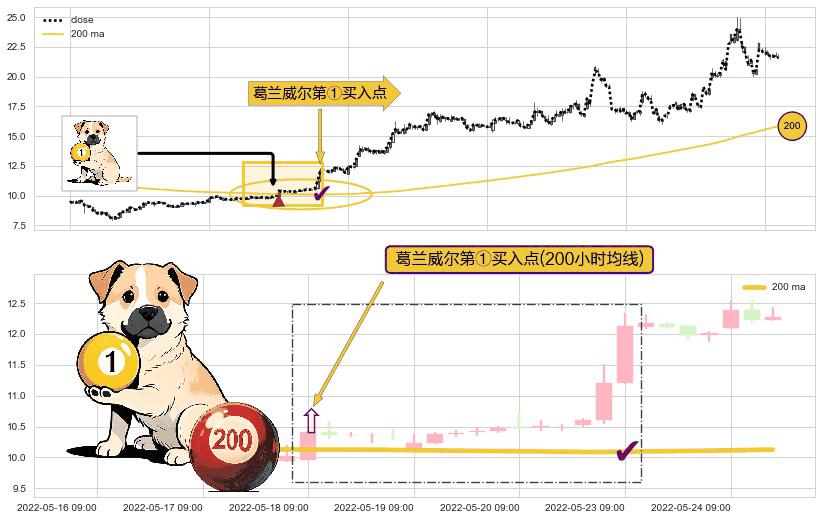 形态多维评估: ⚀ 2022-05-18 09:00:00-小时显现 葛兰威尔均线 200小时均线 第买①入点 走势反转见底信号,后市看涨,买进信号