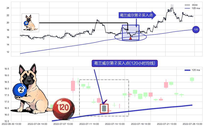 形态多维评估: ⚀ 2022-07-12 13:00:00-小时显现 葛兰威尔均线 120小时均线 第②买入点 上升趋势的中继信号,后市看涨,买进信号