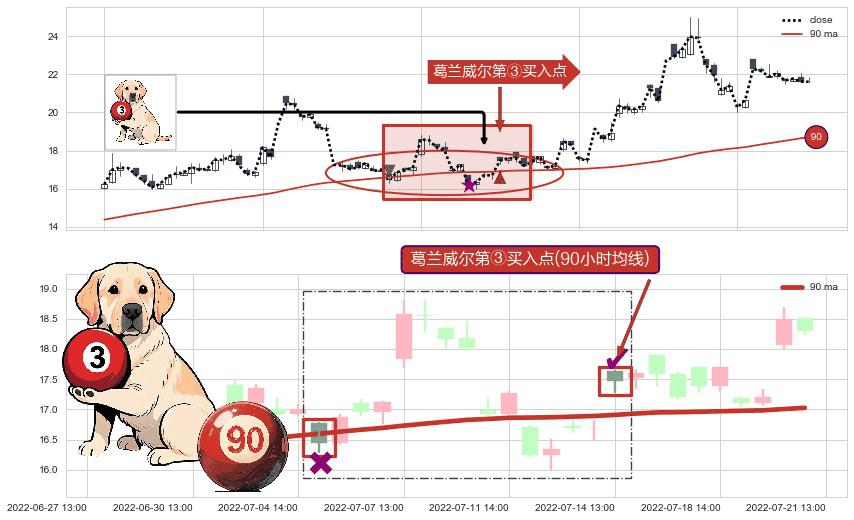 形态多维评估: ⚀ 2022-07-14 13:00:00-小时显现 葛兰威尔均线 90小时均线 第③买入点 上升趋势的中继信号,后市看涨,买进信号
