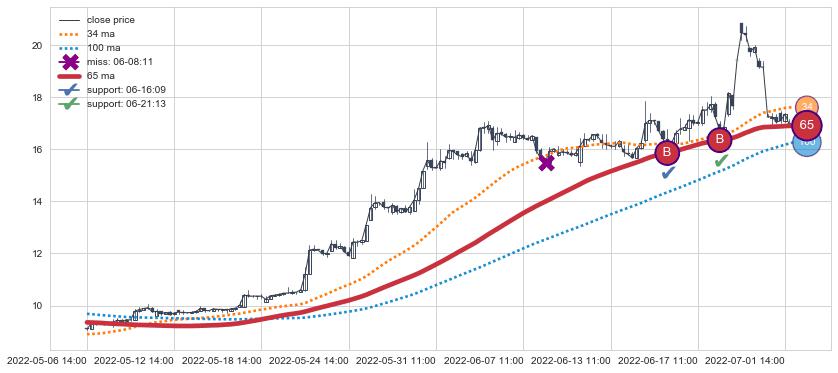 上涨趋势05-06 14:00-07-04 14:00,均线65确认关键支撑2处