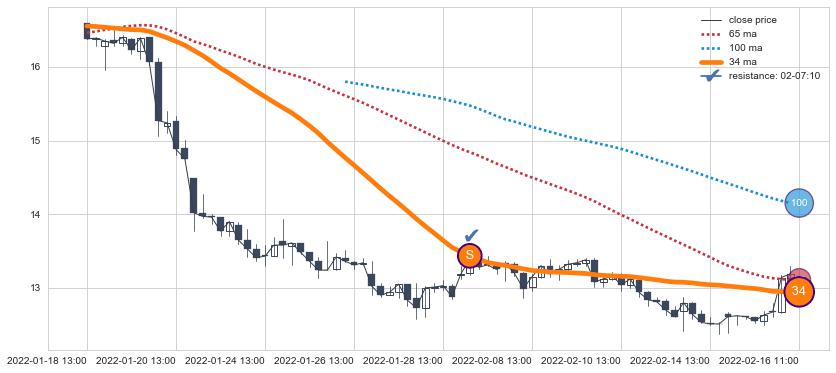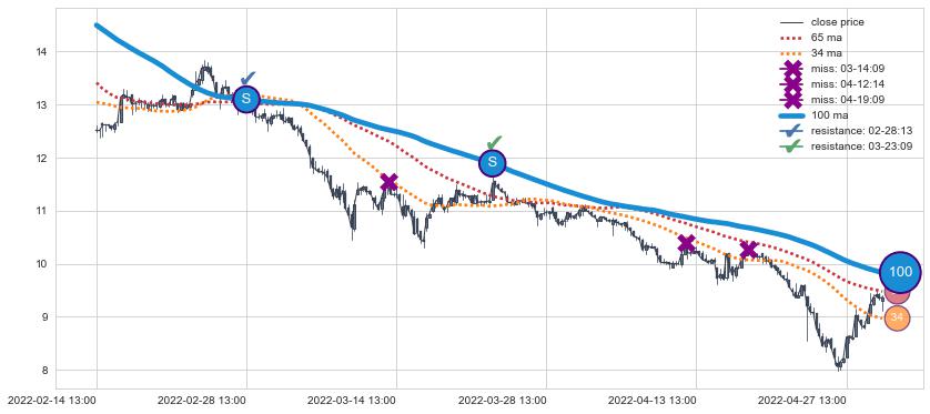 下跌趋势02-14 13:00-05-05 09:00,均线100确认关键阻力2处