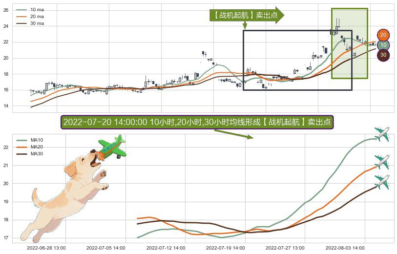 形态多维评估: ⚀ 2022-07-06 14:00:00小时-2022-08-04 14:00:00小时显现 10小时-20小时-30小时均线 【战机起航】卖出点 看空信号,后市看跌,卖出