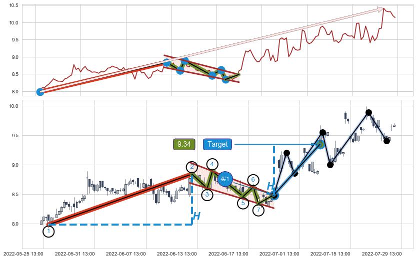 从2022-05-23 10:00至2022-05-31 09:00,共包含30个小时,阶段股价上涨3.05%,阶段股价变动位移路程比: 1 : 7